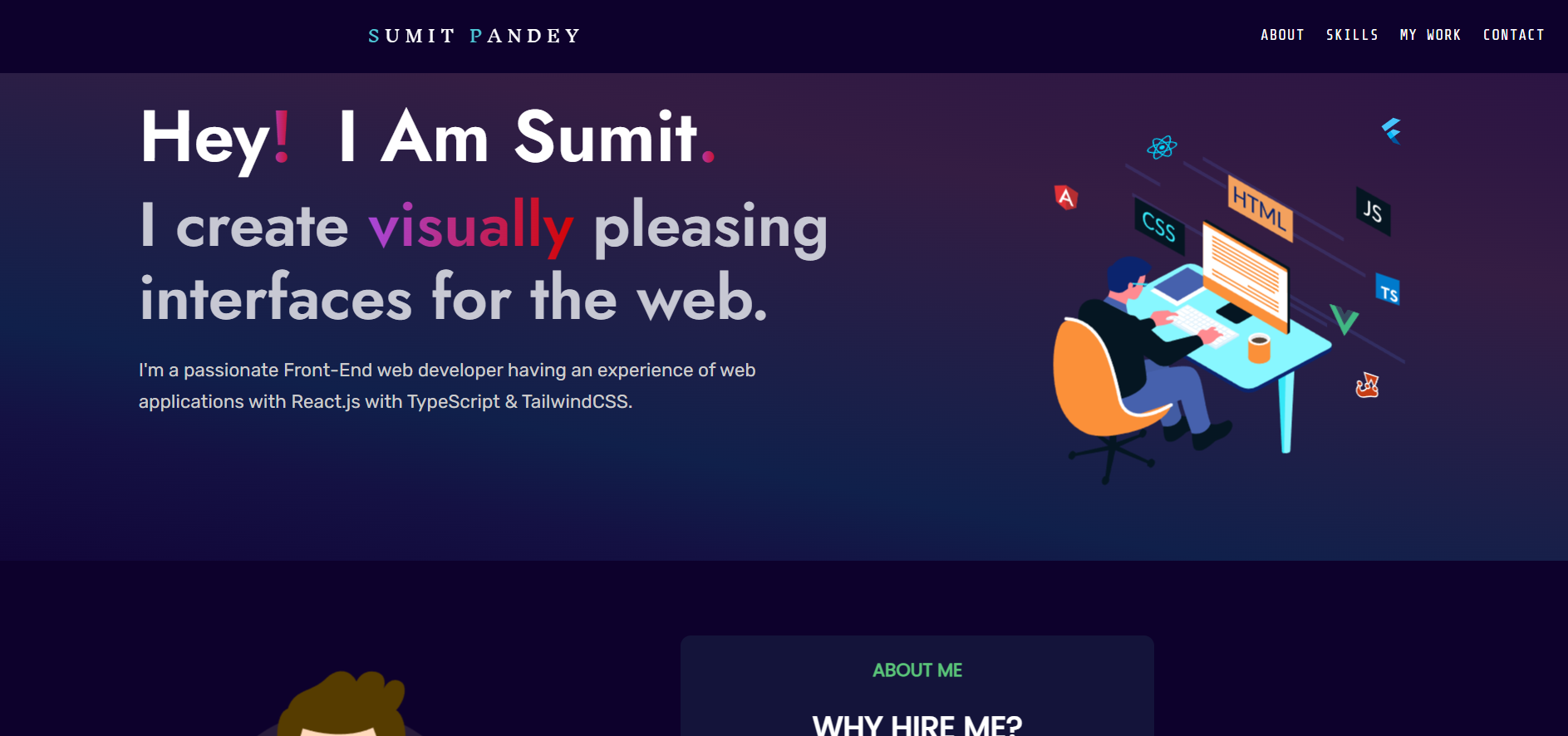 I'm a passionate Front-End web developer having an experience of web applications with React.js with TypeScript & TailwindCSS.